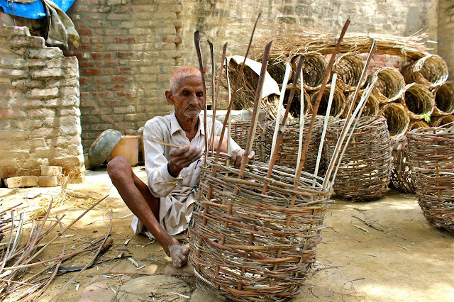 He sits on the mud floor of his aanganor courtyard, in the mid-morning heat of June, under the shade of a neem tree, weaving wooden baskets.